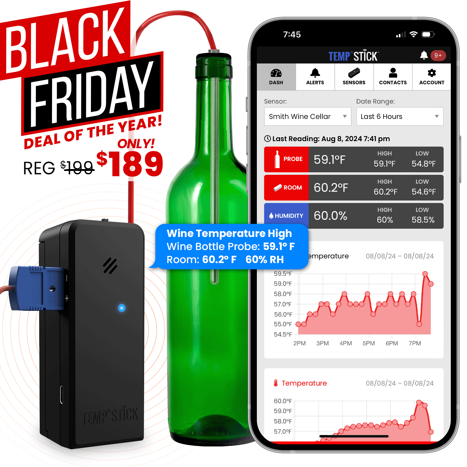 Black Friday Sale – Temp Stick for Wine with WIne Bottle Probe – WiFi Temperature and Humidity Monitor – Black